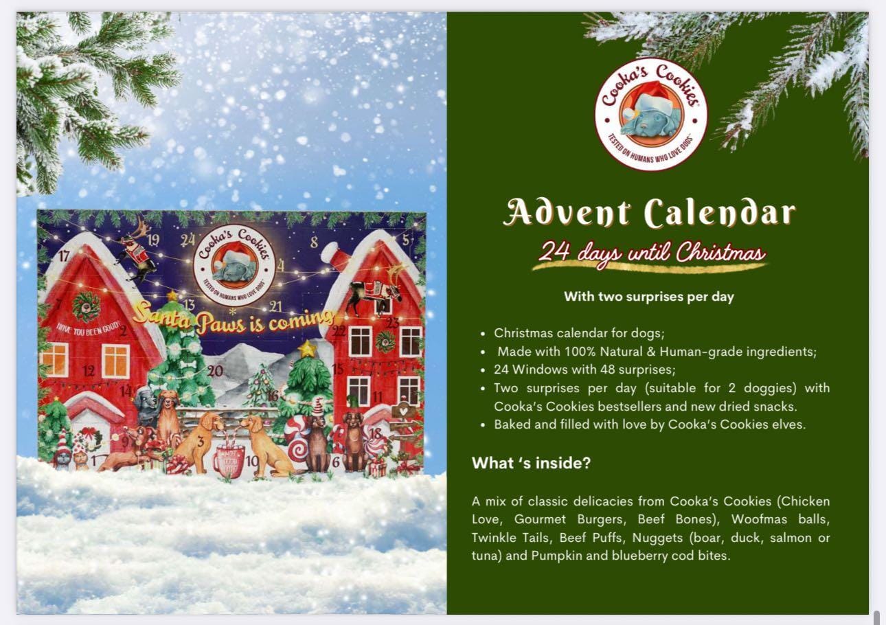 een advent kalender met 24 vakjes om te openen met genoeg lekkers voor 2 hondjes per vakje!